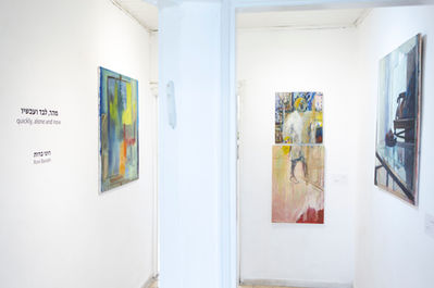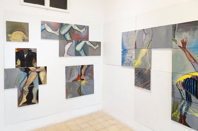 The installation is comprised of units, each one a canvas in the uniform size of 35x35 cm attached to a metal plate by a magnet glued to the reverse side. The attached canvases create a puzzle of dynamic painting that changes and creates different compositions, structures, and meanings. In most of the paintings, parts of the body join together to make a woman’s body dancing and changing positions, changing limbs, clothing, backdrops, and meanings. During the course of the exhibition, the “composition puzzle” changed three times so that the viewer could imagine that the painting itself wants to dance.